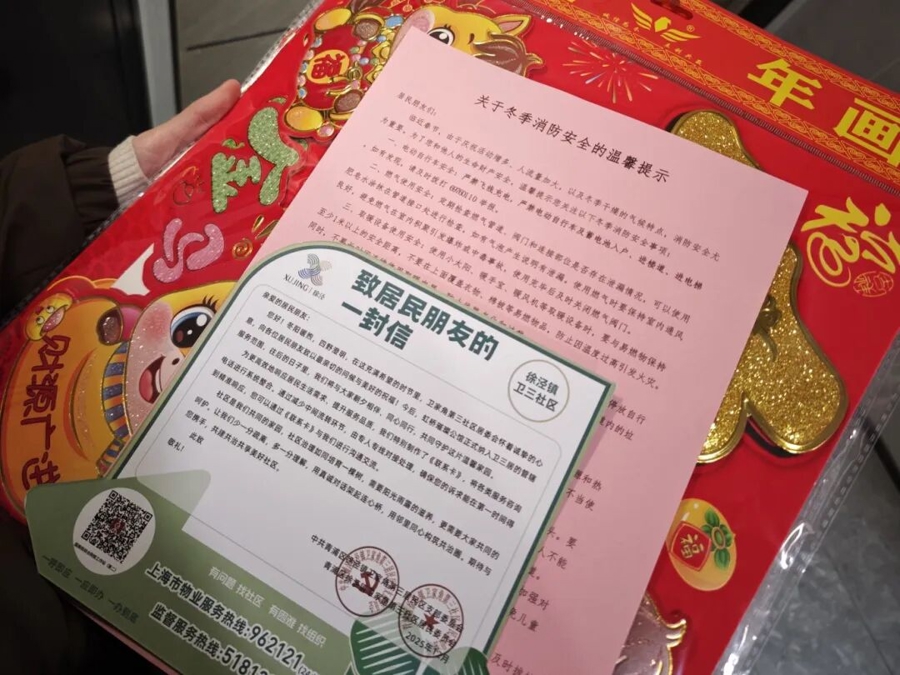 “阿姨,天气冷了创元网,用电取暖一定要注意安全”“插线板别超负荷使用,出门记得关掉电源和燃气阀门。” ……连日来,青浦徐泾镇卫家角第三社区居委会将消防安全温馨提示、联系卡和一张福字贴送到居民家中,用实际行动打通服务群众的“最后一米”。